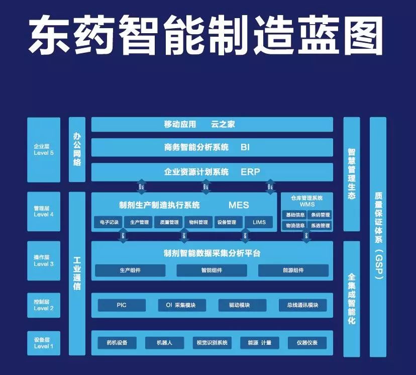 再就是上面搭的制造執(zhí)行系統(tǒng),包括電子批錄、生產(chǎn)管理、配方、過程質量管理、物料管理等。這里面重要的部分就是把藥品的電子記錄部分優(yōu)先做出來,因為它是符合GMP合規(guī)性重要的一部分。當然還有實驗室管理系統(tǒng),這次智能改造的時候,我們會把倉庫完全變成智能倉庫,和數(shù)據(jù)打通。