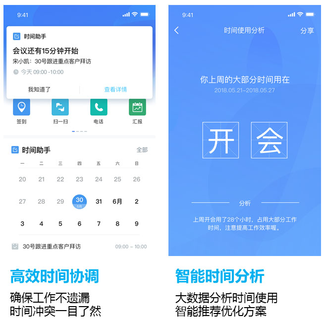 云之家產(chǎn)品總監(jiān)宋凱表示,“時間去哪了”一直是每個工作者的大焦慮。云之家V10推出“時間助手”應(yīng)用,可記錄管理個人日程并自動提醒;通過日程共享,可實現(xiàn)團隊成員時間安排的透明化;通過主動“搶占”領(lǐng)導(dǎo)和同事的時間,可提升整體協(xié)作效率。