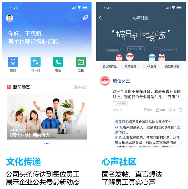 宋凱認為,傳統(tǒng)的企業(yè)文化建設(shè)缺少互動,說教的方式讓年輕人難以接受。云之家同事圈通過線上互動社區(qū)把員工召集在一起,建立新生代的企業(yè)文化。