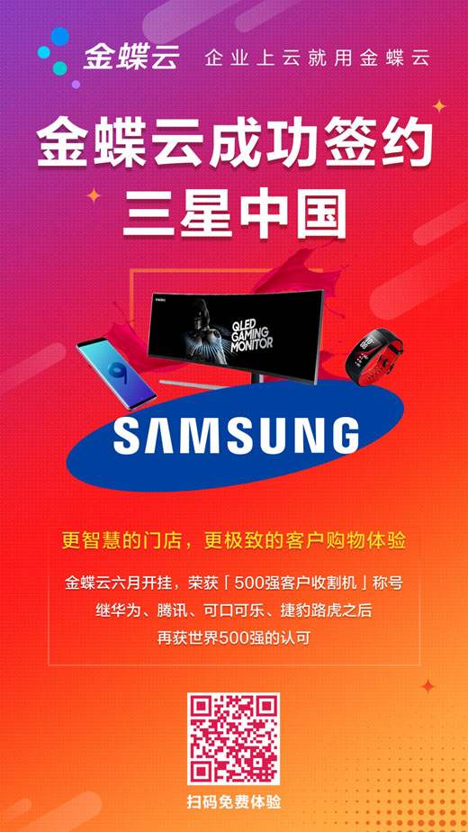 7.4日訊,恭賀金蝶云簽約三星中國。近日,三星中國正式上線金蝶云全渠道營銷系統(tǒng),金蝶云將幫助三星管理上千價(jià)零售門店,這也是繼華為、騰訊、OPPO、阿里、海爾之后,金蝶云簽約的又一世界級名企。