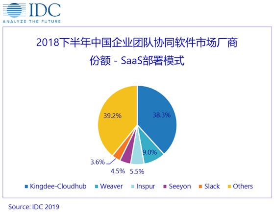 6月10日,全球知名信息技術(shù)咨詢公司IDC發(fā)布新《2018年下半年中國企業(yè)團(tuán)隊(duì)協(xié)同軟件市場(chǎng)跟蹤報(bào)告》。報(bào)告顯示,中國企業(yè)采用SaaS協(xié)同軟件的復(fù)合增長(zhǎng)率為35.3%,增速遠(yuǎn)高于傳統(tǒng)部署模式,到2023年,SaaS模式的企業(yè)團(tuán)隊(duì)協(xié)同軟件市場(chǎng)份額將上升為31.8%。目前,金蝶云之家(Kingdee-Cloudhub)是中國企業(yè)團(tuán)隊(duì)協(xié)同SaaS軟件市場(chǎng)的領(lǐng)導(dǎo)品牌,市場(chǎng)份額為38.3%排名,超過第二名至第五名的總和。