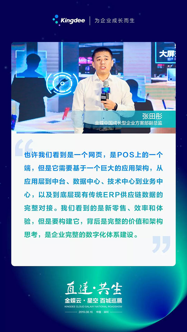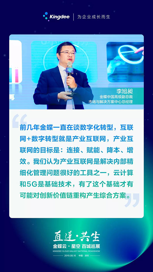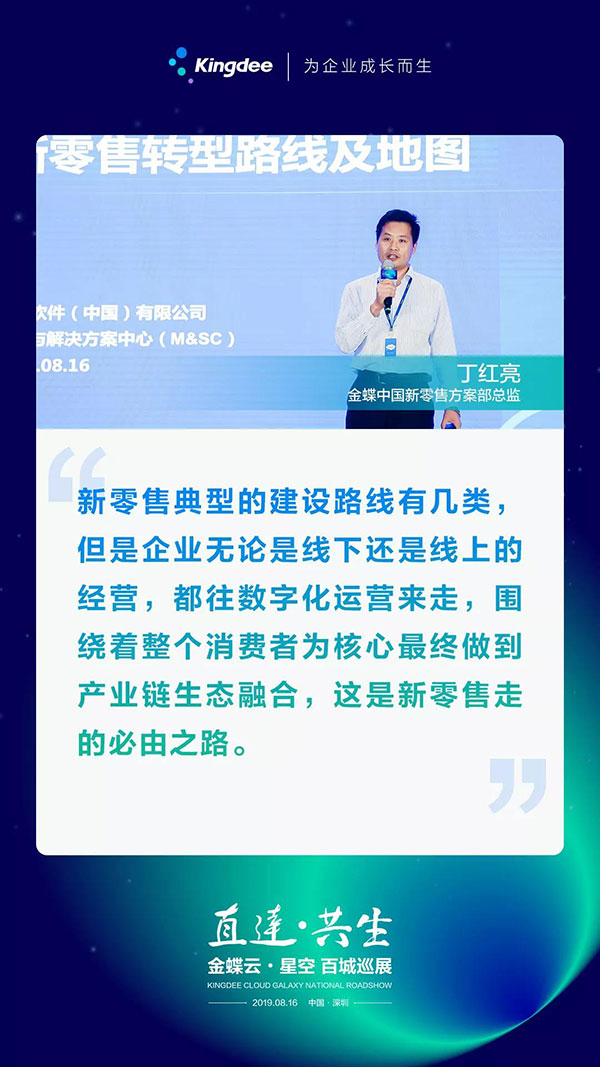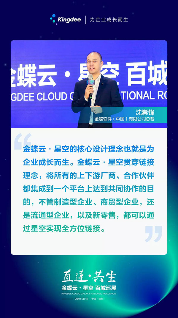 金蝶云·星空百城巡展正式開(kāi)啟,將聯(lián)合業(yè)內(nèi)專(zhuān)家,由深圳出發(fā),為更多地域、更多的企業(yè)家?guī)?lái)企業(yè)上云精彩內(nèi)容分享,助力中國(guó)企業(yè)上云。除此之外,金蝶于9月6日在北京舉辦“金蝶云蒼穹高峰論壇”首站——北京站;10月20日在北京舉辦“2019金蝶云全球用戶大會(huì)”。